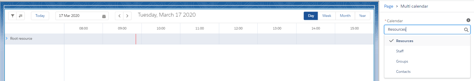 After dropping the component on to the page, in the right panel, select a Calendar. This is the calendar record that will drive configuration for the component. For more information, see: Set up Calendars & Views