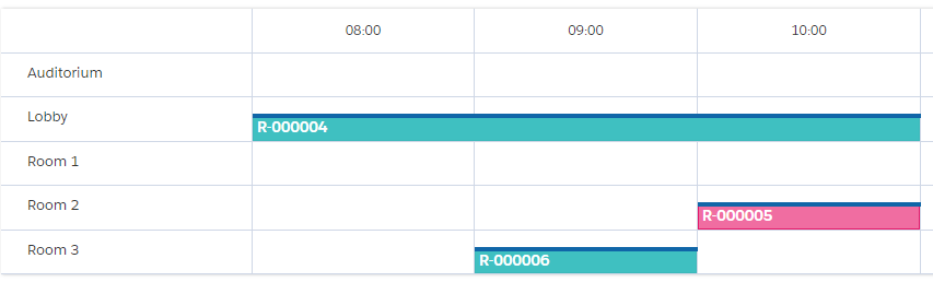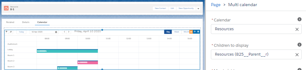 If the Horizontal Calendar component is placed on a record that is a parent of other records containing reservations, it can be configured to show those child records. Our example above is a building with a couple of rooms in it. When configuring the component, simply select which related list contains the children:
