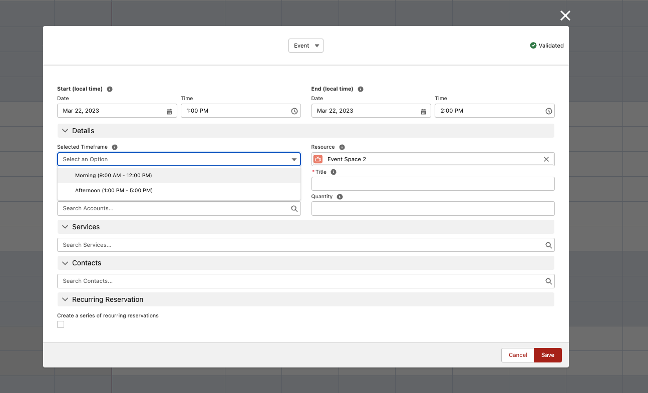 Predefined timeframes allow you to show your calendar users a dropdown with preconfigured time ranges. This lets them quickly select a combination of start and end times.