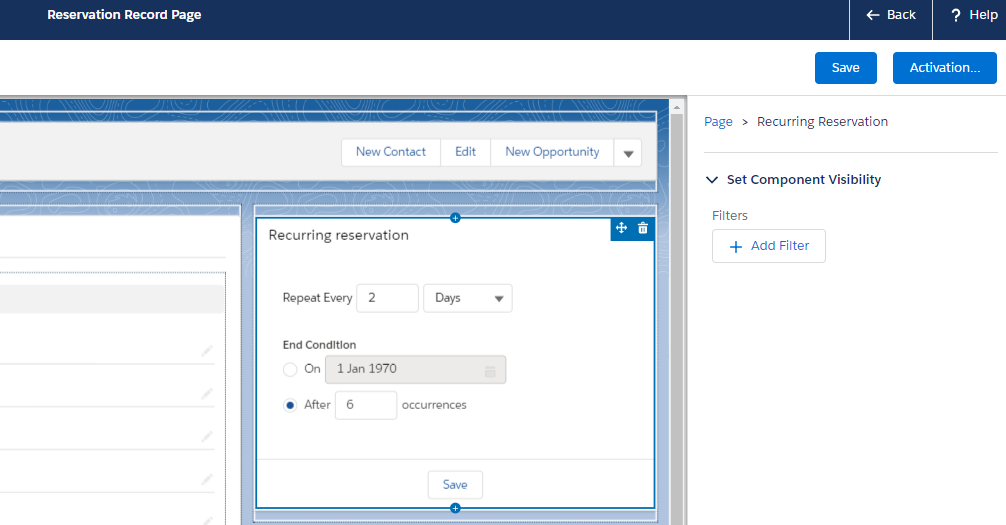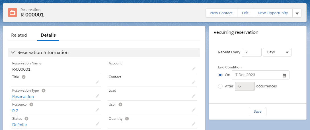 Once you’re on the Reservation record page, use the Recurrence component on the right hand side to make the Reservation recurring.