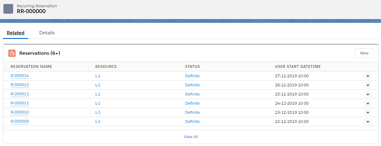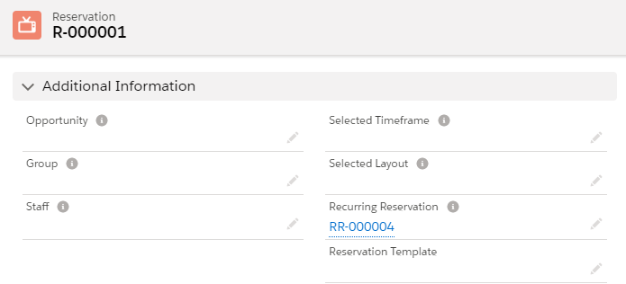 If a Reservation is already recurring, you can view the entire series by going to the Recurring Reservation record. You can tell whether a Reservation is already recurring by looking at the Recurring Reservation lookup in the details of the Reservation. If you have not modified the fields on the Reservation page layout, this field can be found in the section ‘Additional Information’.