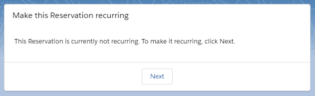 Once the Recurring component has been added to the Reservation record page, it will be visible to users. Users can use the component to convert an existing Reservation to a Recurring Reservation, or to modify the recurrence of a Reservation that is already recurring.