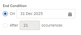 After choosing the recurrence pattern, choose an end condition. You can either have the series end at a specific date, or after a specific number of occurrences.