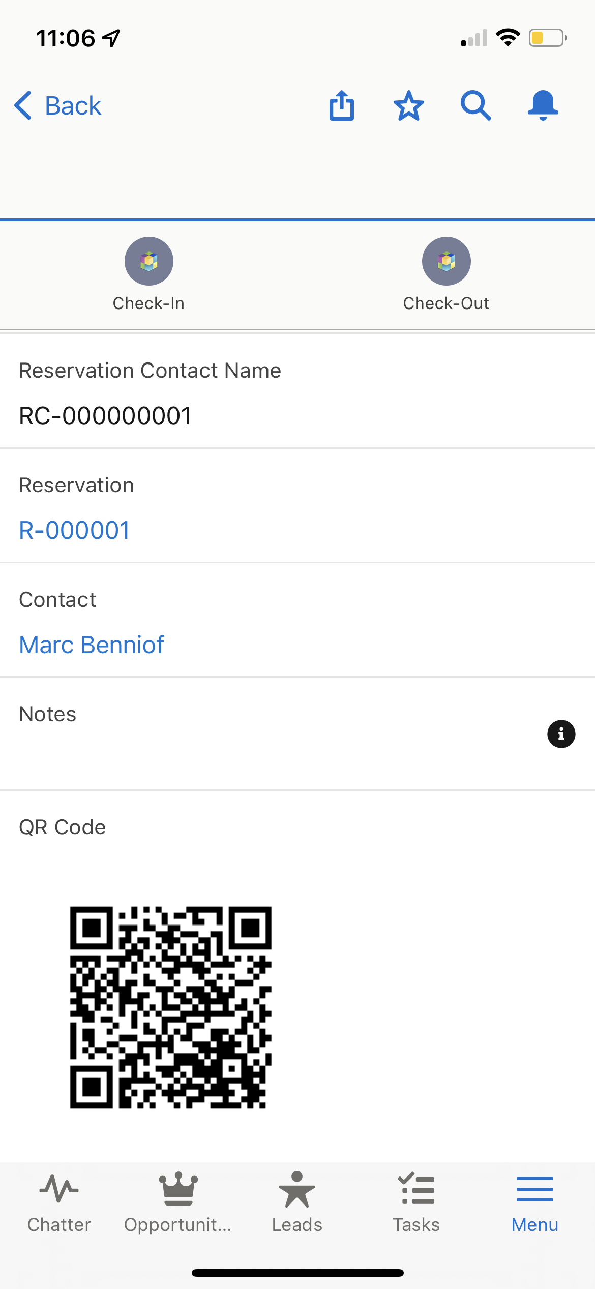 When this QR-code is scanned, it opens the Salesforce mobile app on the record page. On this page there are two buttons one to check in, and one to check out.