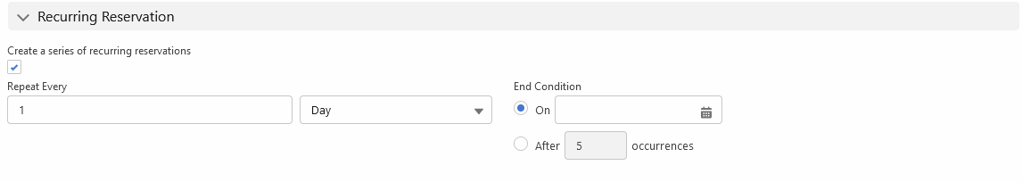 If the Recurring Reservation section is not visible, ask your admin to make sure the setting “Enable recurring reservations” has been enabled.