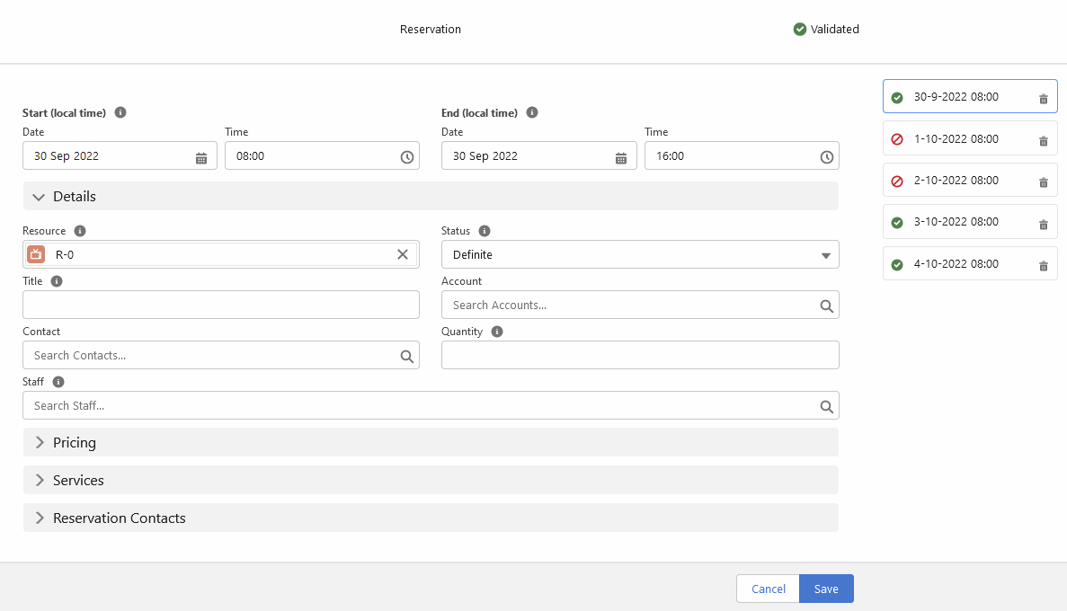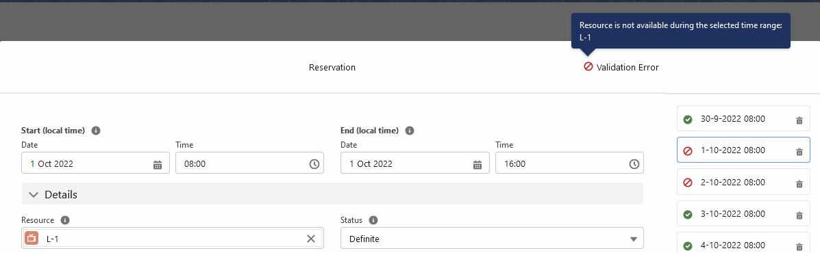 In the panel, valid reservations are marked with a green symbol, while invalid reservations are marked with a red symbol. To fix invalid reservations, you can click on them in the side panel, and then in the main form you can make any changes necessary to that individual reservation.