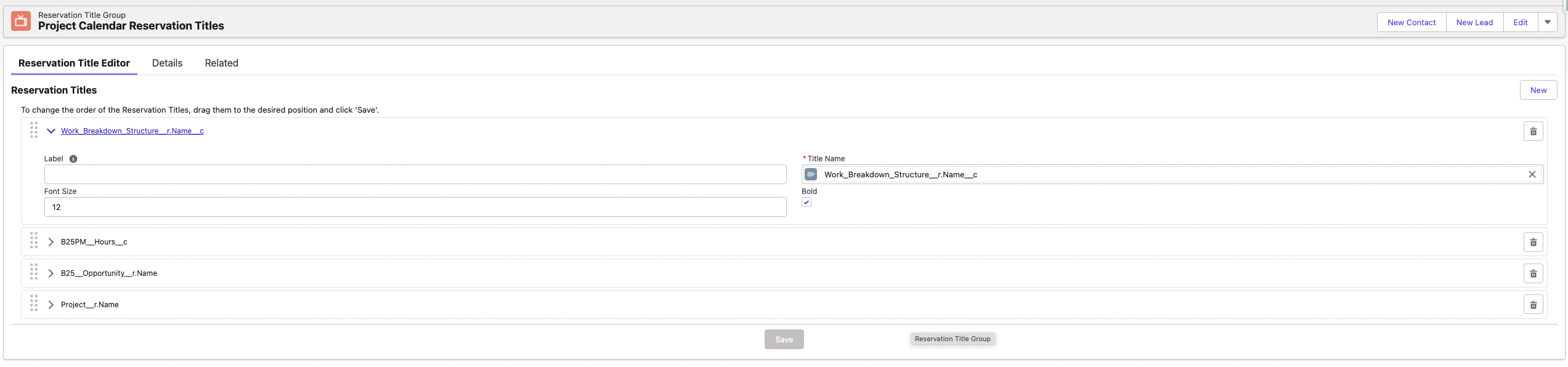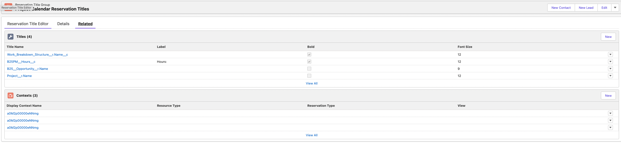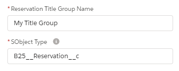When creating a new Reservation Title Group yourself, in the required field 'SObject Type' make sure to fill in 'B25__Reservation__c'. The only exception is when creating title groups for the Schedule calendars, in which case the value should be 'B25__Reservation_Template__c'.