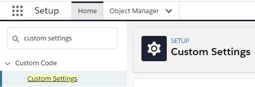In setup, enter ‘custom settings’ in the search box: