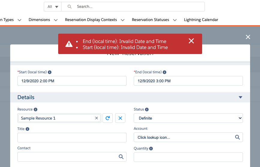 You or you users may receive an 'Invalid Date and Time' error when trying to save a Reservation from the calendar:
