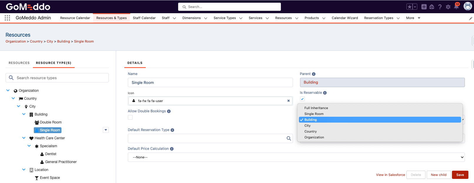 To make exceptions to this inheritance, use the 'Availability Defined At' picklist on the Resource Type. In the screenshot below, the Room resource type is set to inherit its availability from the Building it belongs to. This means that only availabilities defined on the Building or the specific Room itself will have an effect on each room. Set this field to 'Full Inheritance' to return to the normal situation where availabilities are inherited from every resource above it.
