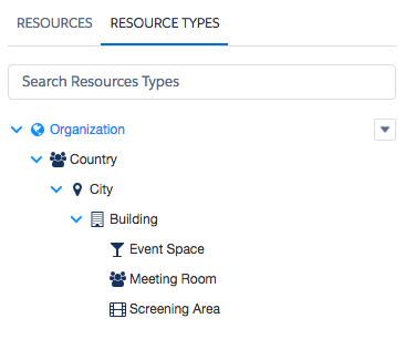 The Resource Type hierarchy allows you to define an overall structure of your organisation, reflecting the type of resources you want to manage and how these are structured. For example: meeting rooms, which are located in a building, within a city, within a country.