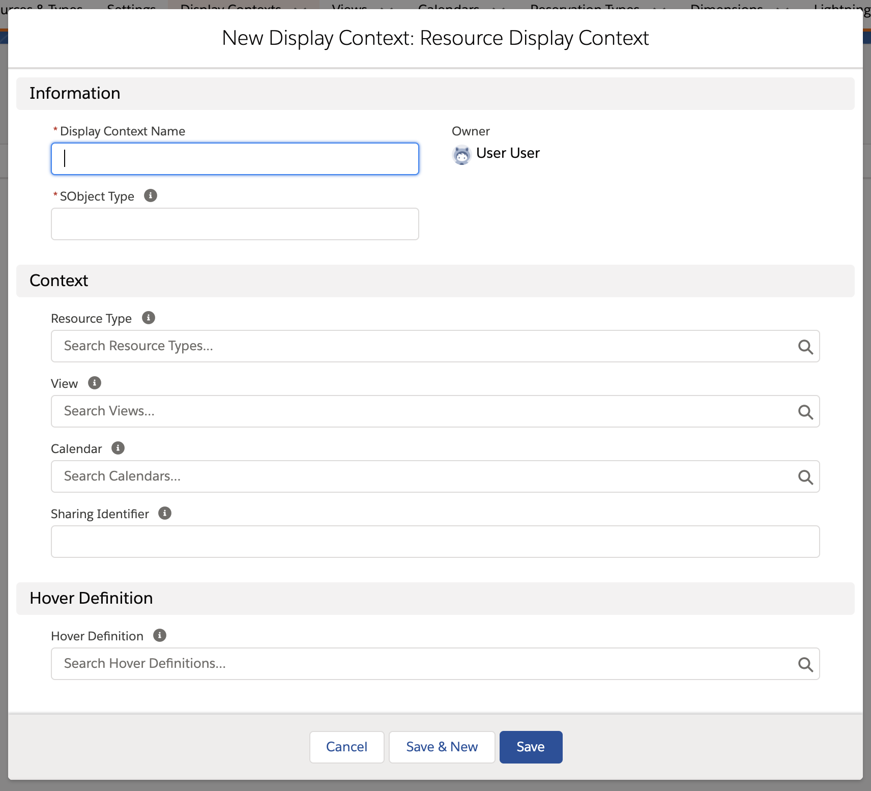 In the Information section, fill in a name of your choice, and an SObject Type. The SObject Type here would be the dimension that this Resource Display Context is being created for. For example, for the Resource Calendar, the SObject Type would be B25__Resource__c.