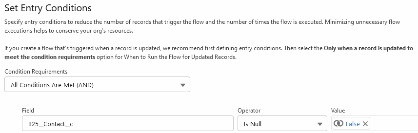 Keep in mind that if you change the recipient of the email, it is advisable to modify the entry conditions of the flow to check that the recipient field is not empty. The unmodified version of the flow does this for the B25__Contact__c field: