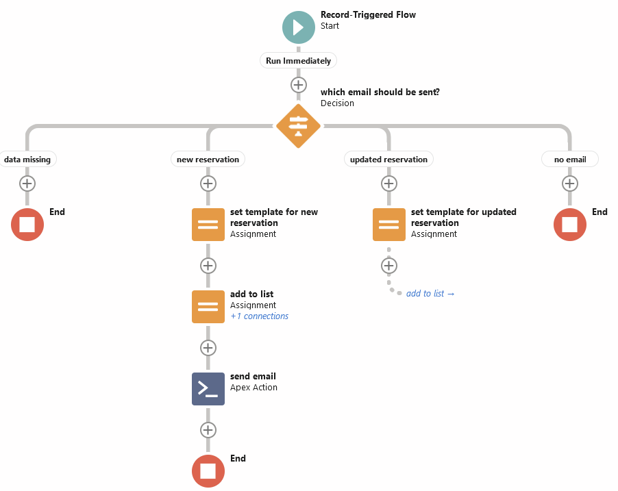 By default, this flow will send out the email template named Reservation Details for new reservations, and Reservation Updated for changed reservations. If you want to change the text of the emails being sent, you can simply edit the contents of these email templates. If you want to use different email templates, you can edit the two ‘set template for new/updated reservation’ assignments: