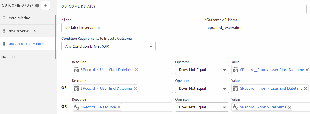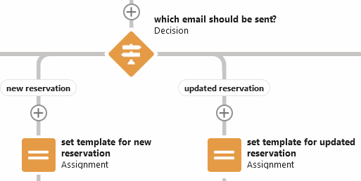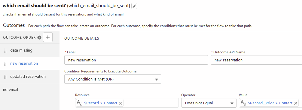 If other things should trigger an ‘updated reservation’ email for your organization, you can edit the ‘updated reservation’ outcome in the ‘which email should be sent?’ decision (pictured below).