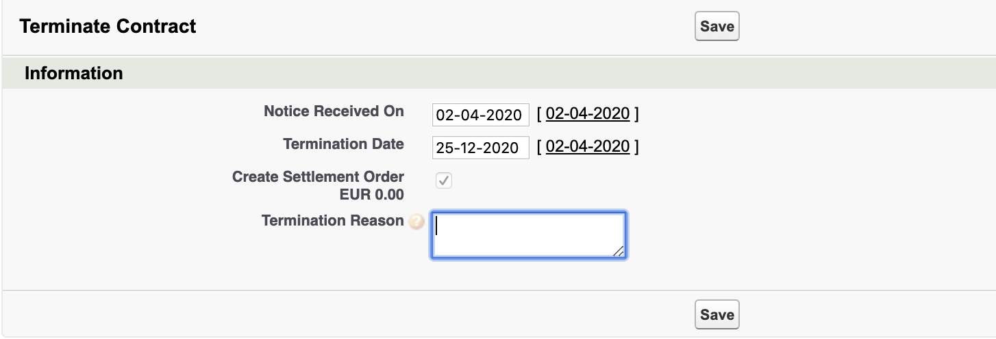 The terminate button, which gives you the option to specify when you received the termination and why the client decided to cancel the contract. This logic will determine if the contract should move to closed or terminated.