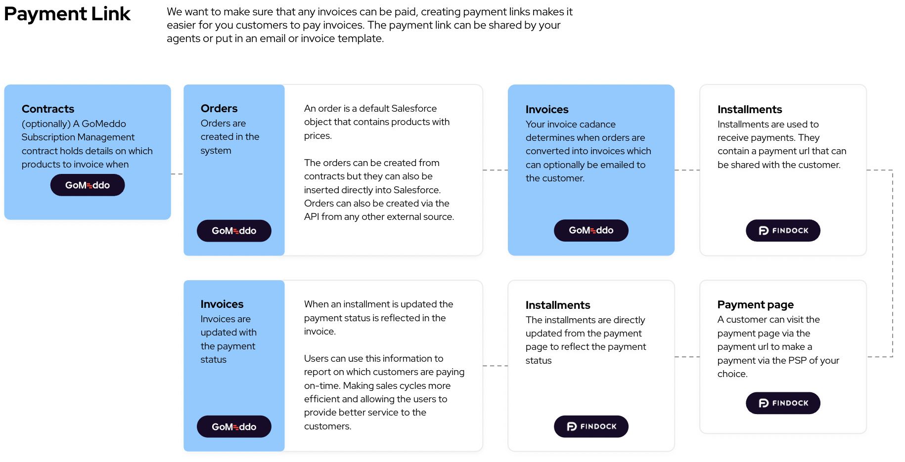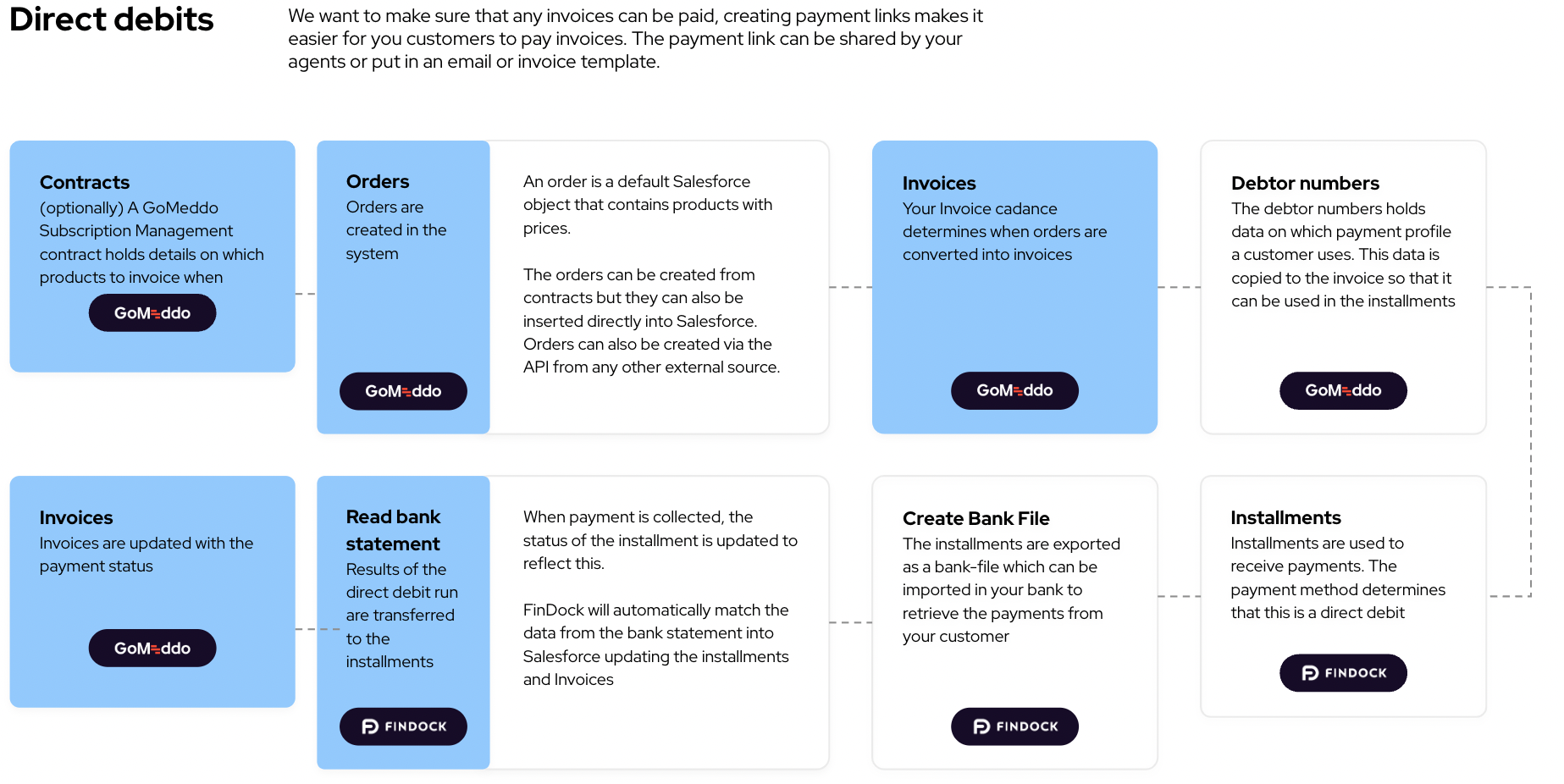 The FinDock connector automatically creates “installments” in FinDock when an Invoice is created. To support this we need to combine information between both GoMeddo Subscription Management and FinDock, which data is specified in the next chapter.