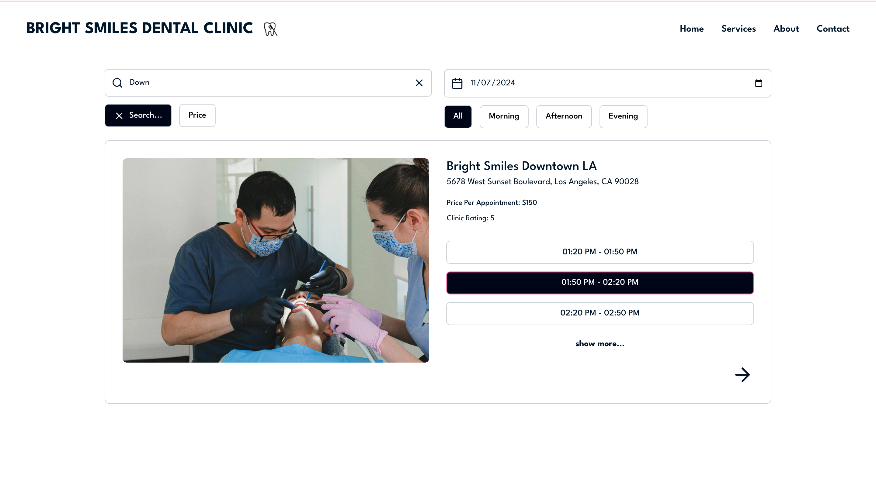 The application dashboard features a list of dental clinics, showcasing available reservation time slots for the current day for the specified clinic. The system gets these time slots based on the concurrent availability of both Resources (specific dental clinics) and Staff members. Users can filter their clinic search using keywords, select a specific date, choose preferred time slots (morning, afternoon, evening), and filter by price range to identify suitable appointments.